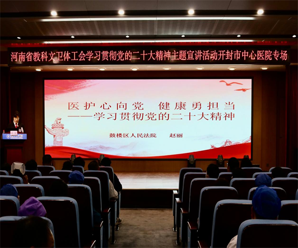 中新河南網(wǎng)4月21日電:為深入學(xué)習(xí)宣傳貫徹黨的二十大精神,進一步深化法治宣傳教育,4月20日,開封市鼓樓區(qū)人民法院員額法官、市級勞動模范趙麗來到市中心醫(yī)院,以《醫(yī)護心向黨 健康勇?lián)?dāng)——學(xué)習(xí)貫徹黨的二十大精神》為題 ,為200余名干部和醫(yī)護人員帶來了一場生動、詳實的專題講座。