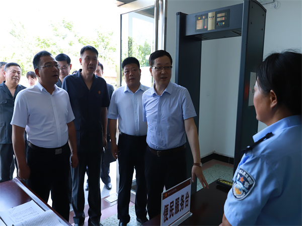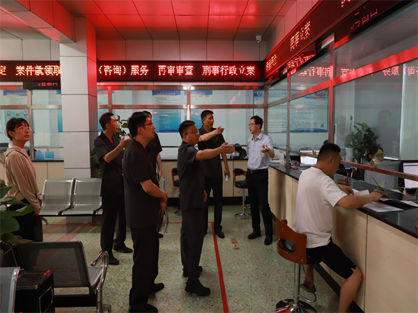 吳志軍一行首先來到尉氏縣人民法院蔡莊法庭,查看法庭安檢設(shè)施、審判庭、干警辦公區(qū)及生活區(qū)等設(shè)施,聽取法庭“立審執(zhí)一體化”改革、參與訴源治理、無訟村(社區(qū))創(chuàng)建等工作情況,吳志軍對蔡莊法庭主動延伸審判職能,積極參與基層社會治理的作法予以高度評價。隨后,調(diào)研組又來到尉氏法院實地查看了訴訟服務(wù)中心、執(zhí)行卷管中心等場所,聽取訴服質(zhì)效、執(zhí)行權(quán)運行機制改革等有關(guān)情況。