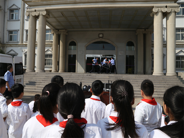 隨后,同學(xué)們觀看了司法警察日常工作、訓(xùn)練宣傳片。司法警察大隊干警帶領(lǐng)同學(xué)們參觀了審判庭、監(jiān)控室、羈押室、警車等,并向同學(xué)們演示了庭審押解流程,通過干警耐心細致地講解與演示,讓孩子們直觀地了解司法警察維護嚴(yán)肅庭審秩序的工作日常。