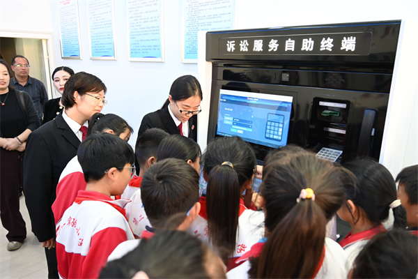 在訴訟服務(wù)中心,干警靳永朝為大家詳細(xì)介紹立案流程和窗口職能,并帶領(lǐng)同學(xué)們體驗(yàn)訴訟服務(wù)自助終端設(shè)備操作,感受“一站式”訴訟服務(wù)的高效便利。