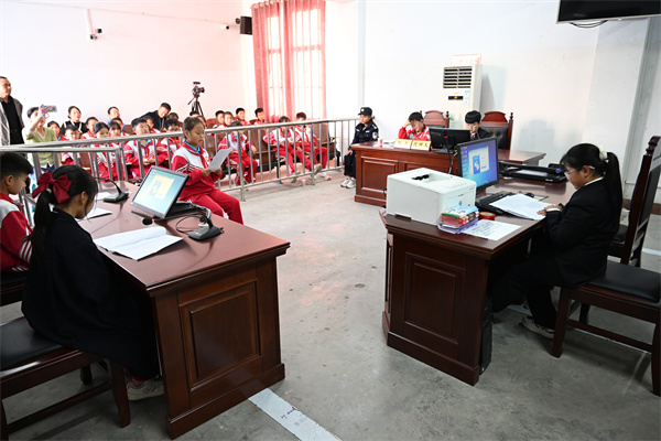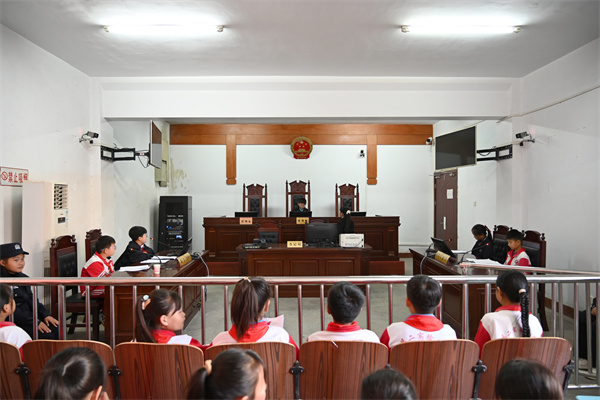 模擬法庭現(xiàn)場(chǎng),開封市祥符區(qū)第二實(shí)驗(yàn)小學(xué)的同學(xué)們正在“審理”一起校園人身傷害案件,干警辛翔宇對(duì)庭審流程進(jìn)行指導(dǎo)完善,并對(duì)同學(xué)們的問題進(jìn)行耐心解答。在法槌的一起一落間,親身體驗(yàn)審判流程,這一刻,法治的種子在同學(xué)們的心中生根發(fā)芽。通過將校園中常見的問題帶入法庭進(jìn)行由同學(xué)們親自“審理”,引導(dǎo)同學(xué)們?cè)谟龅侥Σ梁蜎_突時(shí),要善于做情緒的主人,冷靜沉著地應(yīng)對(duì)突發(fā)狀況,及時(shí)向老師和家長(zhǎng)尋求幫助。