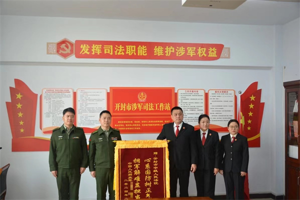 中新河南網(wǎng)2月29日電:近日,中國人民解放軍某部隊(duì)向開封中院及禹王臺(tái)法院贈(zèng)送了寫有“心系國防樹正氣 擁軍解難顯擔(dān)當(dāng)”及“恪盡職守解兵憂 擁軍解難顯擔(dān)當(dāng)”的錦旗,對開封法院的涉軍維權(quán)工作表示肯定與感謝。