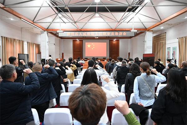 新任人民陪審員宣誓儀式上,全體新任陪審員高舉右拳,莊嚴(yán)宣誓。