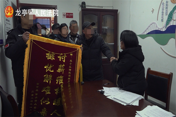 第三天,調(diào)解員李運(yùn)景在調(diào)解過程中全力以赴保障農(nóng)民工的權(quán)益,贏得了雙方當(dāng)事人的贊賞,農(nóng)民工們集體送來了錦旗表達(dá)感謝。