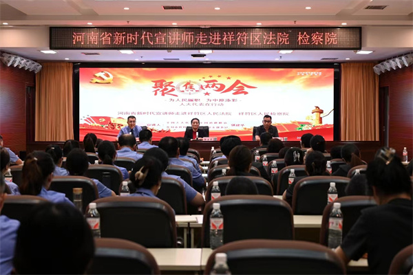 中新河南網(wǎng)5月30日電:5月29日,河南省新時(shí)代宣講師走進(jìn)祥符區(qū)人民法院、祥符區(qū)人民檢察院,祥符區(qū)法檢“兩院”百余名干警其齊聚一堂,共同聆聽全國(guó)人大代表、全國(guó)道德模范、開封市祥符區(qū)電影公司黨支部書記郭建華宣講2024年全國(guó)“兩會(huì)”精神,并上了一堂生動(dòng)深刻的黨紀(jì)學(xué)習(xí)教育黨課。祥符區(qū)檢察院黨組書記、檢察長(zhǎng)代朝輝主持,祥符區(qū)法院黨組書記、院長(zhǎng)孫照君致辭,并號(hào)召大家以郭代表為榜樣,向郭代表學(xué)習(xí)。