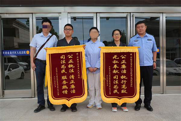 中新河南網(wǎng)6月27日電:6月26日,一起合同糾紛案件的當(dāng)事人來(lái)到開封市龍亭區(qū)人民法院,將兩面寫有“公正執(zhí)法 清正廉潔 司法為民 服務(wù)熱情”和“公正廉潔 執(zhí)行高效 無(wú)私奉獻(xiàn) 司法為民”字樣的錦旗送到執(zhí)行干警的手中,對(duì)他們公正、高效、盡心盡責(zé)追回4600多萬(wàn)元巨額案款表示感謝。