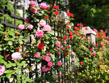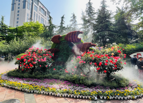 來到五一公園西門口,映入眼簾的是滿墻的藤本月季成團成簇,如瀑布般從圍墻上涌下,形成了一道花墻。步入公園,西門入口處和中心廣場擺放的以《年年有魚》和《云想花賞》為主題的兩組立體花壇,迎接著游客賞悅,盆景月季和樹狀月季造型優(yōu)美、枝葉茂盛,色彩明艷的品種月季和時令草花蜿蜒其間,形成彩色的漩渦,令人神往、陶醉不已。
