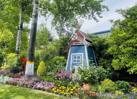 園區(qū)1500平方的地栽月季開的熱烈,紅色月季花在枝頭怒放,像陽光下的一團團熊熊烈火;黃色、香檳色月季相互交疊,像鮮艷絢麗的晚霞;粉紅的月季花苞,嬌羞待放,像小女孩的臉蛋那么可愛。主游路擺放的32盆樹狀月季和花瓶、花柱造型月季,與色彩艷麗的2萬余株草花搭配使用,層層疊疊,微風(fēng)吹過,像是在花的海洋中掀起一波一波彩色波浪。在“風(fēng)車”景點,打造微地形,精選500株宿根花卉及彩葉植物,通過層次凸顯、色彩搭配、造型點綴等造景手法,打造童話般的花鏡。