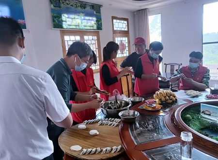 村支兩委干部和平橋區(qū)政法委工作人員共同精心準(zhǔn)備著,擇菜、和面、剁餡搟皮,現(xiàn)場(chǎng)忙得熱火朝天,大家分工明確,熱情滿滿,邊干活邊拉家常,快樂(lè)洋溢在每個(gè)人臉上。
