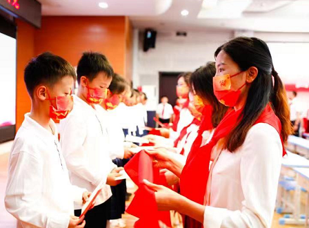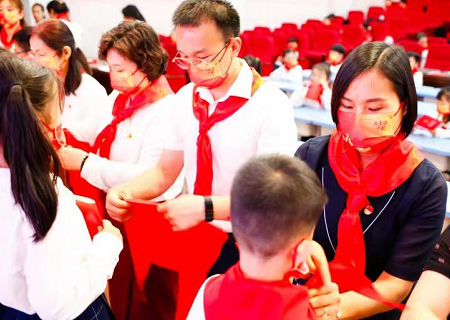 在歡快的歌聲中,黨員、團(tuán)隊(duì)教師代表鄭重地為新隊(duì)員系上了鮮艷的紅領(lǐng)巾,新隊(duì)員們目光堅(jiān)毅,洋溢著自豪的笑容。這是星星火炬交接的時(shí)刻,更代表著紅色基因代代相傳!從此,鮮艷的紅領(lǐng)巾飄蕩在胸前,無上的光榮涌動(dòng)在新隊(duì)員們的心中。