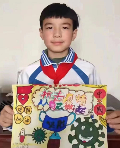 2021年安陽疫情爆發(fā),全民抗疫。胡敬淵作為一名少先隊(duì)員,做不了醫(yī)生護(hù)士,也做不了志愿者,但他能做一名抗“疫”小戰(zhàn)士,只要呆在家里不外出,保護(hù)好自己,配合社區(qū)做核酸檢測,就是在為抗“疫”做貢獻(xiàn)!隔離病毒,不能隔離愛。他制作了一幅幅設(shè)計(jì)新穎、圖文并茂,浸潤了無限愛心的手抄報(bào),有的講述了如何做好自我保護(hù)抗擊疫情,有的表達(dá)了對沖鋒一線的白衣天使的深深敬意,有的則表達(dá)了對安陽對湯陰的美好祝福……還有一些以錄制視頻的方式,為我們的城市加油、吶喊!他趁每次做核酸的機(jī)會(huì),積極主動(dòng)地向值班卡點(diǎn)的醫(yī)護(hù)人員和工作人員送去手套和熱水,送去溫暖和關(guān)心。