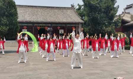 中新河南網(wǎng)7月5日電 2022年7月1日,是中國共產(chǎn)黨建黨101周年。在這個特殊的日子里,來自河南全省各地的太極拳愛好者50余人在紅色太極創(chuàng)始人、鄭州王西安拳法研究會會長曹沁紅會長帶領(lǐng)下走進太極圣地溫縣陳家溝,開啟了太極文化研學(xué)之旅。在太極拳始祖陳王廷塑像前,隊員們統(tǒng)一身著白色太極服、紅色披紗,在《我愛你,中國》悠揚的小提琴曲中,共同演練由王西安老師創(chuàng)編的辦公室養(yǎng)生太極八式,展現(xiàn)了太極拳運動的舒緩優(yōu)雅之美,吸引眾多游客駐足觀看、拍照留念,成為當(dāng)日陳家溝風(fēng)景區(qū)最靚麗的一道風(fēng)景。