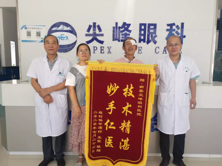 家住新蔡縣練村鎮(zhèn)、中國(guó)好人、好媳婦王霞的公公患有白內(nèi)障到新蔡尖峰眼科醫(yī)院找楊院長(zhǎng)治療。在護(hù)理老人住院期間,親眼目睹了楊院長(zhǎng)帶領(lǐng)的新蔡尖峰醫(yī)院的髙水平醫(yī)療技術(shù)與優(yōu)質(zhì)服務(wù)全過(guò)程。出院后為感謝楊院長(zhǎng)和他帶領(lǐng)的醫(yī)療團(tuán)隊(duì)特贈(zèng)一面錦旗上書:“技術(shù)精湛、妙手仁醫(yī)”。