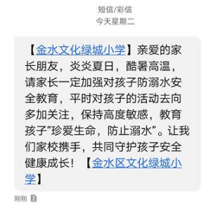 金水區(qū)文化綠城小學一位家長又收到學校“校信通”的安全提醒短信。這位家長表示,從暑假開始每天都能收到了學校的一條“防溺水”的安全提醒短信息,這不僅提醒家長加強監(jiān)督,看護好孩子。同時,提醒廣大學生提高自我安全意識。這樣的舉措很有必要!