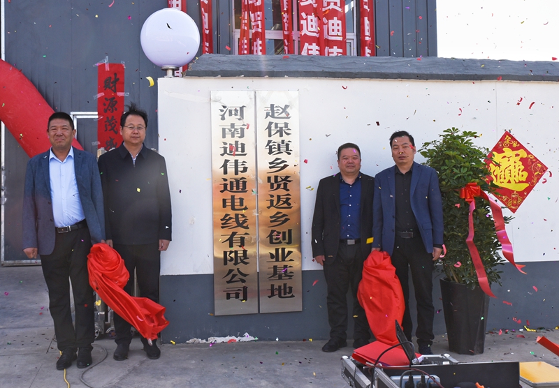 宜陽縣委統(tǒng)戰(zhàn)部副部長蘇杰、縣鄉(xiāng)村振興局局長苗新奇、趙保鎮(zhèn)黨委書記陳建峰、迪偉通電線有限公司總經(jīng)理董繼偉共同為趙保鎮(zhèn)鄉(xiāng)賢返鄉(xiāng)創(chuàng)業(yè)基地、河南迪偉通電線有限公司揭牌。