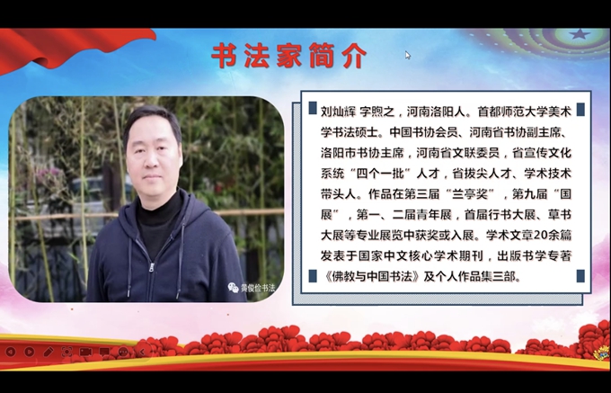 河南省書法家協會副主席、洛陽市書法家協會主席劉燦輝通過線上,向大家做了題為《書法選帖臨帖與創(chuàng)作入門》的專題報告,他通過引經據典,深入淺出地告誡師生們要“取法經典,守正創(chuàng)新”。