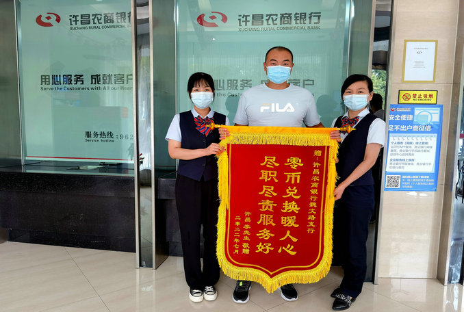中新河南網(wǎng)7月27日(梁靖 馮軍麗)“真的是太感謝你們了,每一次都耐心地幫我們把硬幣兌換成整錢,咱農(nóng)商行的服務(wù)就是好!我們自己都覺(jué)得不好意思了,今天專門過(guò)來(lái)給你們送個(gè)錦旗,表示感謝!”客戶李先生在許昌農(nóng)商銀行魏文路支行營(yíng)業(yè)廳,開心地和工作人員們拉著家常。