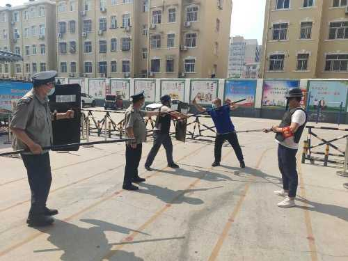 上午9:40分,演練開始,“歹徒”手持兇器欲強行闖入校園,學(xué)校立即啟動反恐應(yīng)急響應(yīng),兩名保安迅速上前阻擋,其余安保人員手持棍棒和保安一同與“歹徒”展開搏斗,“歹徒”無法沖入學(xué)校,最終在校門口被大家合力制服。