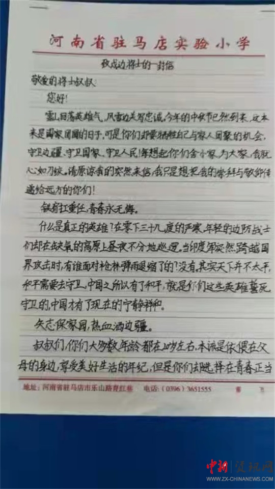寫(xiě)信致敬新時(shí)代戍邊英雄官兵。“雖然您遠(yuǎn)在邊疆,但是我會(huì)永遠(yuǎn)在心里牢記您保家衛(wèi)國(guó)的精神。‘天下興亡,匹夫有責(zé)’,我想向您學(xué)習(xí),長(zhǎng)大后為國(guó)出一份力。”郝若晨同學(xué)在一封《給邊防戰(zhàn)士的一封信》中寫(xiě)到。同學(xué)們紛紛拿起筆飽含深情地為戍邊官兵寫(xiě)信。紙短情長(zhǎng),同學(xué)們寄情于信,鴻雁傳書(shū),向新時(shí)代戍邊英雄官兵致敬。國(guó)防教育知識(shí)流淌在校園的每一個(gè)角落,愛(ài)國(guó)主義情懷激蕩在每一個(gè)學(xué)子的心中。