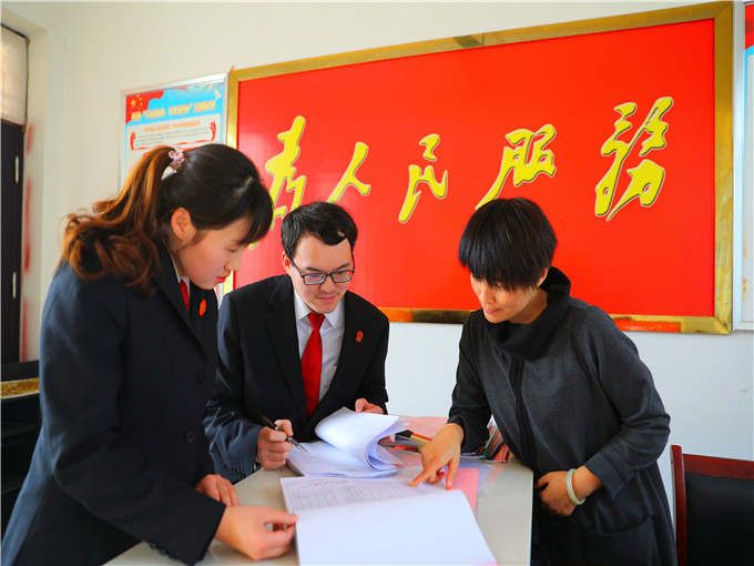 圖①:法官在村部查閱當(dāng)事人土地底冊(cè),確定土地畝數(shù)。