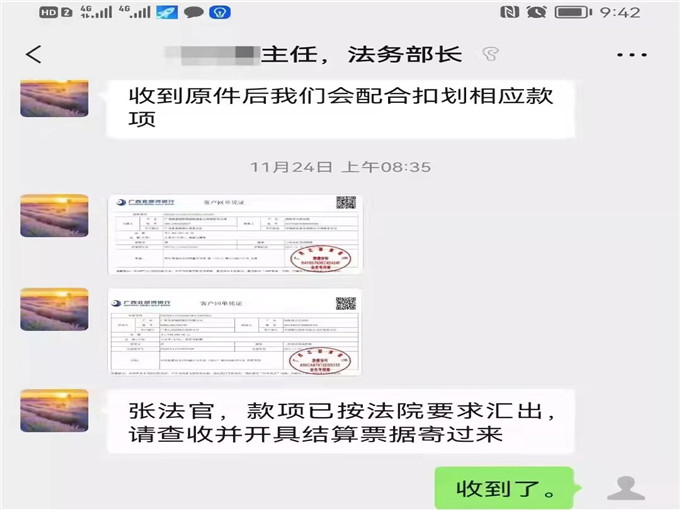 執(zhí)行干警按照申請(qǐng)人提供的企業(yè)賬戶線索,依法進(jìn)行了查詢,發(fā)現(xiàn)企業(yè)名下并無財(cái)產(chǎn)可供執(zhí)行,但執(zhí)行干警并未放棄,經(jīng)仔細(xì)研究,發(fā)現(xiàn)該化冶公司存在公司名稱變更歷史,且變更后的企業(yè)名下有一筆到期貨款,執(zhí)行干警立即將該筆貨款凍結(jié),但由于疫情原因無法去往當(dāng)?shù)剡M(jìn)行扣劃,于是執(zhí)行干警又通過電話與新公司的法務(wù)部部長取得聯(lián)系,耐心做對(duì)方思想工作,告知其不履行生效判決的后果。對(duì)于經(jīng)營者而言,賬戶被查封固然可怕,但企業(yè)信譽(yù)受到影響更是難以彌補(bǔ),會(huì)直接影響企業(yè)今后的經(jīng)營活動(dòng)。經(jīng)過幾個(gè)回合的調(diào)解,終于功夫不負(fù)有心人,對(duì)方公司同意郵寄接收法律文書,工作證等,并全額履行生效法律文書確定的義務(wù),案件得以成功結(jié)案。