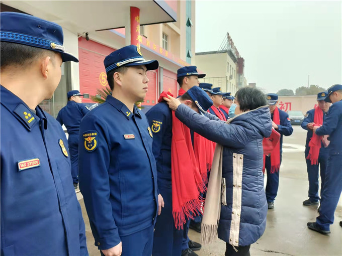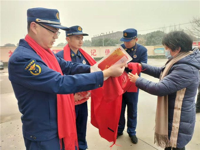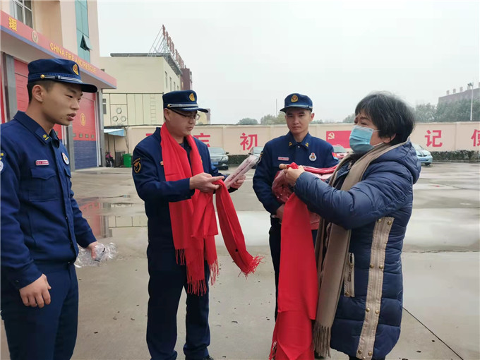 這位烈士母親拆開箱子,拿出一條條紅色的圍巾,逐人為官兵們圍上,然后對待孩子般為他們細(xì)心的整理。紅色的圍巾宛若紅色的火焰,在凜冽中傳遞著濃濃暖意。姚靜會飽含熱淚,她動情地說:“春節(jié)到了,做為大川的母親 ,我對部隊(duì)軍人有一種特殊的感情。軍人是一種特殊的職業(yè)。你們?yōu)榱俗鎳捕ê腿嗣裥腋#h(yuǎn)離家鄉(xiāng),遠(yuǎn)離親人,來新野從事消防救援工作,我為你們感到光榮和驕傲。雖然我失去了大川,但看見了你們就好像又見到了自己的兒子。心里感到很欣慰!今天我買了點(diǎn)生活用品、小小一點(diǎn)心意來望大家。祝全體官兵新春愉快、身體健康、萬事如意!”
