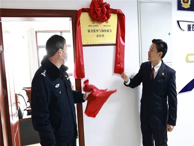 市檢察院黨組成員、副檢察長潘玉亭與市公安局黨委委員、副局長張志剛共同為偵查監(jiān)督與協(xié)作配合辦公室揭牌。