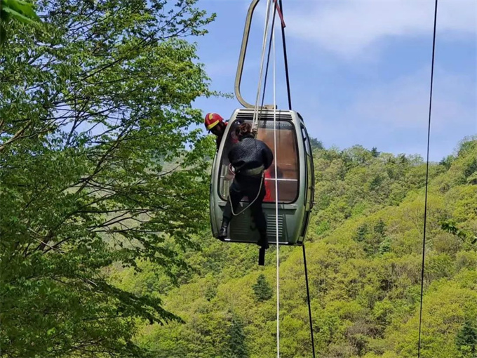本次演練模擬老界嶺景區(qū)客運索道電控系統(tǒng)出現(xiàn)嚴(yán)重故障,索道短時間內(nèi)無法恢復(fù)正常運行,轎廂高空滯留,1名乘客被困高空突發(fā)事件的應(yīng)急救援工作。事件發(fā)生后,索道公司第一時間啟動應(yīng)急救援預(yù)案,迅速組織高空救援組、安全保衛(wèi)組、醫(yī)療救治組、后勤保障組等進行救援。按照救援程序,專業(yè)救援人員首先攜帶鋼索通過滑索高空移動到被困人員轎廂頂部,隨后主救隊員固定好錨點,從轎箱頂部進入車廂對被困游客進行安撫,幫助“被困游客”穿戴好安全設(shè)備后,立即實施垂直救援解救受困游客。主救隊員和地面接應(yīng)人員相互配合,利用緩降器勻速將游客滑降至地面順利降落 ,被困人員安全著陸后,醫(yī)療救護組立即對其身體狀況進行檢查,并護送下山,同時,相關(guān)技術(shù)人員迅速排查事故原因,對事故設(shè)施進行進一步診斷,并在查明原因后, 做好事件跟蹤處置工作。