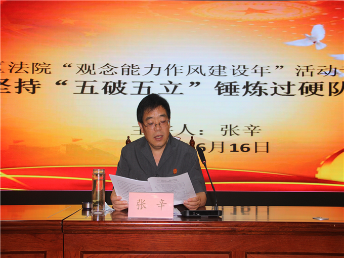 中新河南網(wǎng)6月16日電(李克選 李涵玉 魏錁)為推動“觀念能力作風(fēng)建設(shè)年”活動走深走實,進一步轉(zhuǎn)變司法理念和工作作風(fēng),提升干警整體素質(zhì),全力開創(chuàng)法院工作新局面,6月16日,南陽市臥龍區(qū)人民法院黨組書記、院長張辛以《堅持“五破五立” 錘煉過硬隊伍》為題講授了一場生動而深刻的專題黨課。該院在家班子成員、審判委員會專職委員、中層正副職、各審判執(zhí)行團隊的員額法官、執(zhí)行團隊長參加。