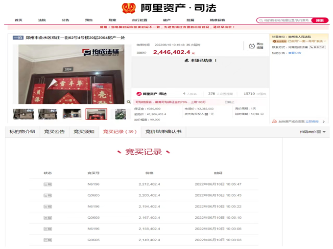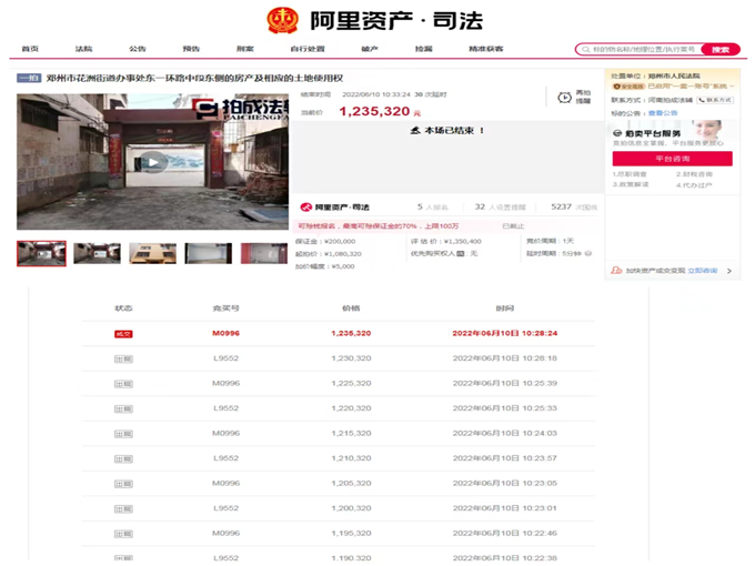此次拍賣的兩件拍品分別是位于鄭州金水區(qū)和鄧州市花洲街道辦事處的兩處房產(chǎn)。在拍賣前期,財(cái)產(chǎn)處置團(tuán)隊(duì)的法官做了大量的準(zhǔn)備工作。通過轉(zhuǎn)發(fā)公眾號(hào)、朋友圈等方式積極宣傳,提高拍賣房產(chǎn)曝光率,吸引群眾關(guān)注。在掛網(wǎng)公示期間,不少群眾來電咨詢了解情況,由于疫情等原因,拍賣鄭州的房產(chǎn)不能隨時(shí)看房,執(zhí)行法官在嚴(yán)格遵守疫情防控政策的情況下,有計(jì)劃地先后組織兩批共40余人前去實(shí)地看房;位于鄧州的房產(chǎn),一旦有群眾有參與意向,執(zhí)行法官第一時(shí)間就組織人員前去看房,先后達(dá)五十余次。拍賣開始后,兩件拍品分別經(jīng)過30余輪競(jìng)價(jià),吸引兩萬(wàn)余人次觀看,最終以高于起拍價(jià)的價(jià)格成功拍賣。