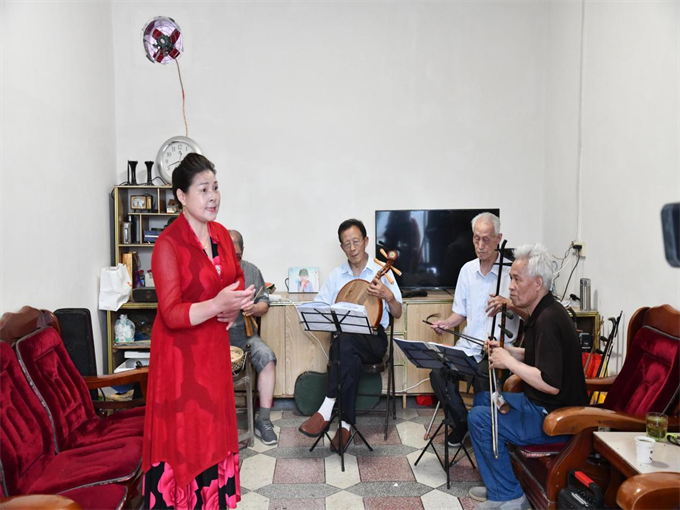 中新河南網(wǎng)6.27日電(鄭翠 張朝甫 黨青一)近日,在二胡、月琴、梆子的伴奏下,一場別開生面的戲曲排練在唐河縣新安社區(qū)的三眼井景點進(jìn)行著,《蘇三起解》、《追韓信》、《嫦娥奔月》、《貴妃醉酒》等經(jīng)典劇目選段一一上演,精彩紛呈的表演引得圍觀者連連叫好、掌聲不斷。這是唐河縣老年劇團(tuán)的一次日常排練,成立于2021年的老年劇團(tuán)由河南省非物質(zhì)文化遺產(chǎn)傳承人方清亮發(fā)起,主要成員為退休的教師、職工、劇團(tuán)演員等民間戲曲愛好者。