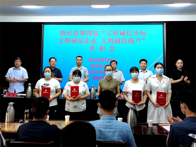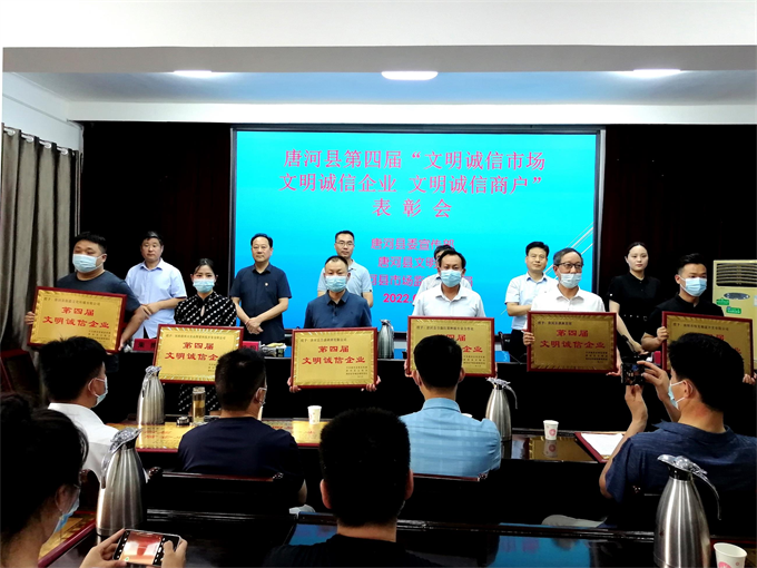 中新河南網(wǎng)6月28日電(鄭翠 劉穎玲 孫玉紅)6月28日,唐河縣召開文明誠信經(jīng)營表彰大會,對榮獲2021年度“文明誠信市場”“文明誠信企業(yè)”“文明誠信商戶”榮譽(yù)稱號的唐河縣和信農(nóng)貿(mào)有限公司、唐河縣幸福家園建設(shè)工程有限公司等71家經(jīng)營單位進(jìn)行授牌表彰。