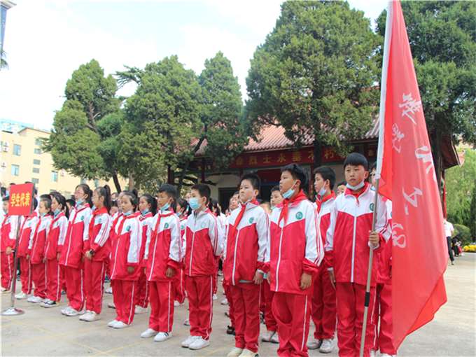默哀畢,少先隊員獻唱《我們是共產(chǎn)主義接班人》,并高舉右手、齊敬隊禮,表達對先烈的敬仰,立志繼承先烈意志,報效祖國和人民。隨后,伴隨著《獻花曲》深情的旋律,禮兵抬起花籃,邁著鏗鏘有力的步伐,向烈士紀念塔敬獻花籃!