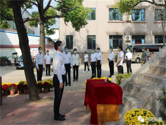 縣委書記趙紅亮,在烈士紀念塔前,為烈士整理花籃緞帶并行注目禮。