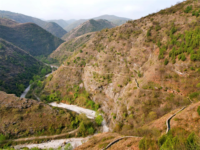沿著石板路拾級而上,來到村寨峰頂英雄渠。舉目遠(yuǎn)眺,英雄渠像玉帶,像長蛇環(huán)繞逶迤在層山峻嶺之中。不知從何處而來,又不知流向何處。英雄渠建材全部取材于千層石,經(jīng)村民粗糙靈活的雙手綿延數(shù)十里鋪就英雄渠。據(jù)說這里的英雄渠比林縣紅旗渠還要早好多年。