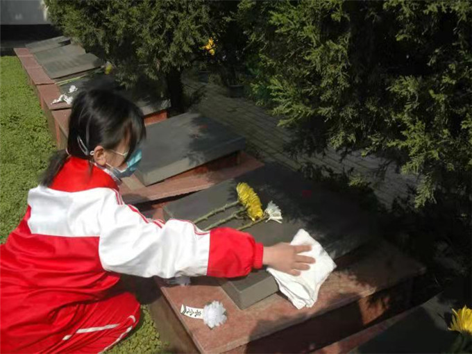 最后,與會(huì)人員向烈士敬獻(xiàn)鮮花,認(rèn)親的少先隊(duì)員們到7位烈士墓前掃墓并擦拭墓碑。